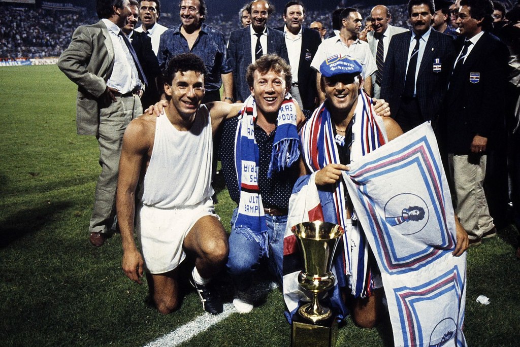 Vialli’s close friendship with former colleague Roberto Mancini actually stemmed back to their playing days together at the Genoa club, where the pair formed a highly formidable attacking duo, largely thanks to Vialli’s goals and Mancini’s assists; due to their combined attacking prowess, they were suitably nicknamed “i gemelli del gol” (“the goal twins,” in Italian) in the press, and are considered to be one of the greatest attacking partnerships of all time, scoring a total of 231 goals together between 1984 and 1992, in addition to winning several titles. Vialli attributes the success of this exciting partnership to legendary Serbian manager Vujadin Boškov, who transformed Vialli from a winger into an out-and-out striker at Sampdoria, with Mancini playing alongside him in a slightly more withdrawn role. Although Vialli was the team’s main goalscorer, Mancini’s role as a second striker allowed him to both score and create goals for his partner; both players established themselves as some of Serie A’s leading forwards. The dynamic duo not only combined well during matches, demonstrating an incredible understanding and strong chemistry, but also maintained a close relationship outside of football, describing themselves as “brothers” (according to Vialli, they only ever argued one time, in training). Together, they led the blucerchiati (“blue–circled,” in Italian, the club’s nickname, a reference to the team’s kit) to their first ever European title in 1990, the Cup Winners Cup, after already reaching the final the previous year, but losing against Barcelona. Vialli finished as top scorer in the 1989–90 edition of the tournament with 7 goals, including both goals in the final victory over Anderlecht; it was indeed in these key moments that Vialli was truly at his finest. He also won three Coppa Italia titles with the Genoese side, scoring a record 13 goals in the victorious 1988–89 edition of the tournament. Aside from the iconic Vialli and Mancini, Sampdoria had a truly wonderful side during this golden era, full of great players, many of whom were Italian, including keeper Gianluca Pagliuca, stopper Pietro Vierchowod, wingers Attilio Lombardo and Ivano Bonetti, as well as Brazilian holding midfielder Toninho Cerezo, among other important team-members, such as Scottish midfielder Graeme Souness and Italian full-back Moreno Mannini. Most significantly, the ‘goal twins’ also led the club to its first ever– and currently only – scudetto during the 1990–91 season (“little shield,” the Italian nickname for the Serie A title, as the league champions sport an Italian tricolour shield on their kit). After the disappointment of the 1990 World Cup, the goal twins, along with several other leading Italian Sampdoria players – fuelled by their limited playing time under Azeglio Vicini – evidently had something to prove; indeed, Vialli also won the capocannoniere title, as the league’s top scorer, with 19 goals. To celebrate the league title, the rebellious and gregarious Vialli (along with several other Samp players) rather strikingly dyed his distinctive mop of thick, dark curly hair platinum blonde! The following season, Sampdoria also went on to reach the European Cup final in 1992, only to be defeated by the so-called Barcelona “Dream Team” at Wembley Stadium in London, U.K., which was managed by legendary Dutch manager and former footballer Johan Cruyff; the Catalan giants won thanks to a late, powerful free kick in extra-time by Dutch sweeper Ronald Koeman, from just outside the box. The final defeat would be Vialli’s last appearance for the club. In total, he scored an impressive 141 goals in 327 appearances across all competition for Sampdoria, with 85 coming in 223 Serie A appearances.